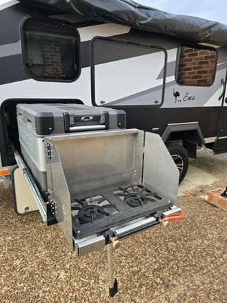 A full outdoor kitchen with 270' awning coverage. It comes fully equipped with a 95l dual zone fridge, cutlery & crockery, 2 burner gas stove & gas bottle. Double bed with foam mattress and seating area.